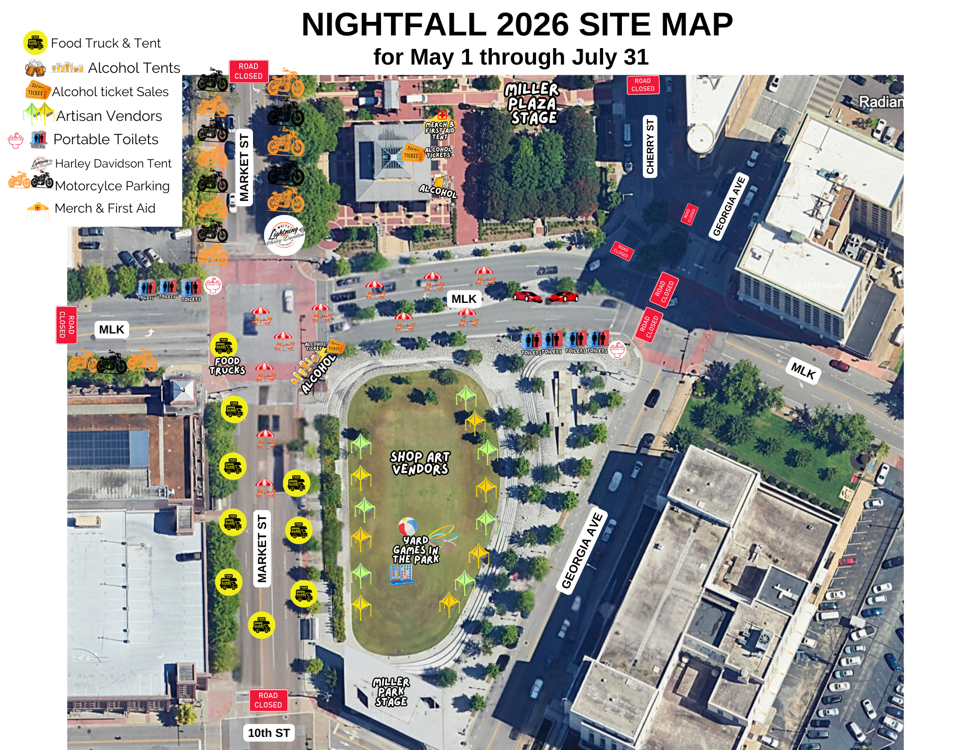 Nightfall is a FREE outdoor concert series held every Friday night from May 1 through July 31, 2026 at Miller Plaza and Miller Park in downtown Chattanooga, located at the corner of Market Street and Martin Luther King Boulevard.